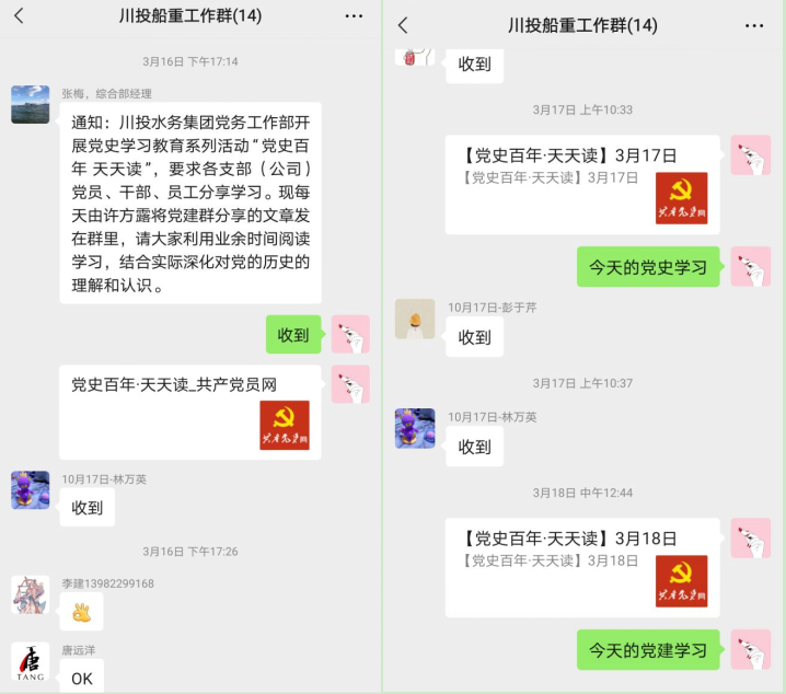 四川川投船重環(huán)境科技有限公司響應(yīng)國家及川投集團、川投水務(wù)集團關(guān)于開展黨史學(xué)習(xí)教育系列活動的具體要求,從3月16日開始,利用微信每日組織公司全體人員學(xué)黨史、用黨史。