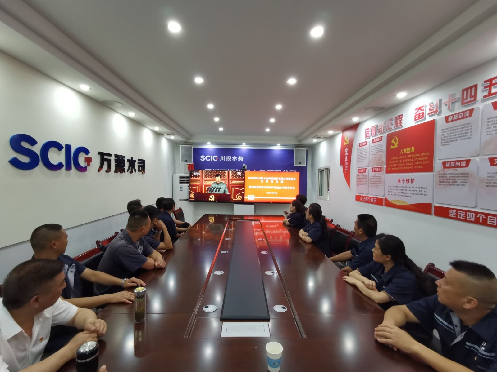 7月1日上午8時,慶祝中國共產(chǎn)黨成立100周年大會在北京天安門廣場隆重舉行。中共中央總書記、國家主席、中央軍委主席習近平發(fā)表重要講話。中共四川川投水務集團股份有限公司委員會萬源黨支部組織黨員干部共計27人,齊聚黨員活動室,收聽收看了大會直播盛況。