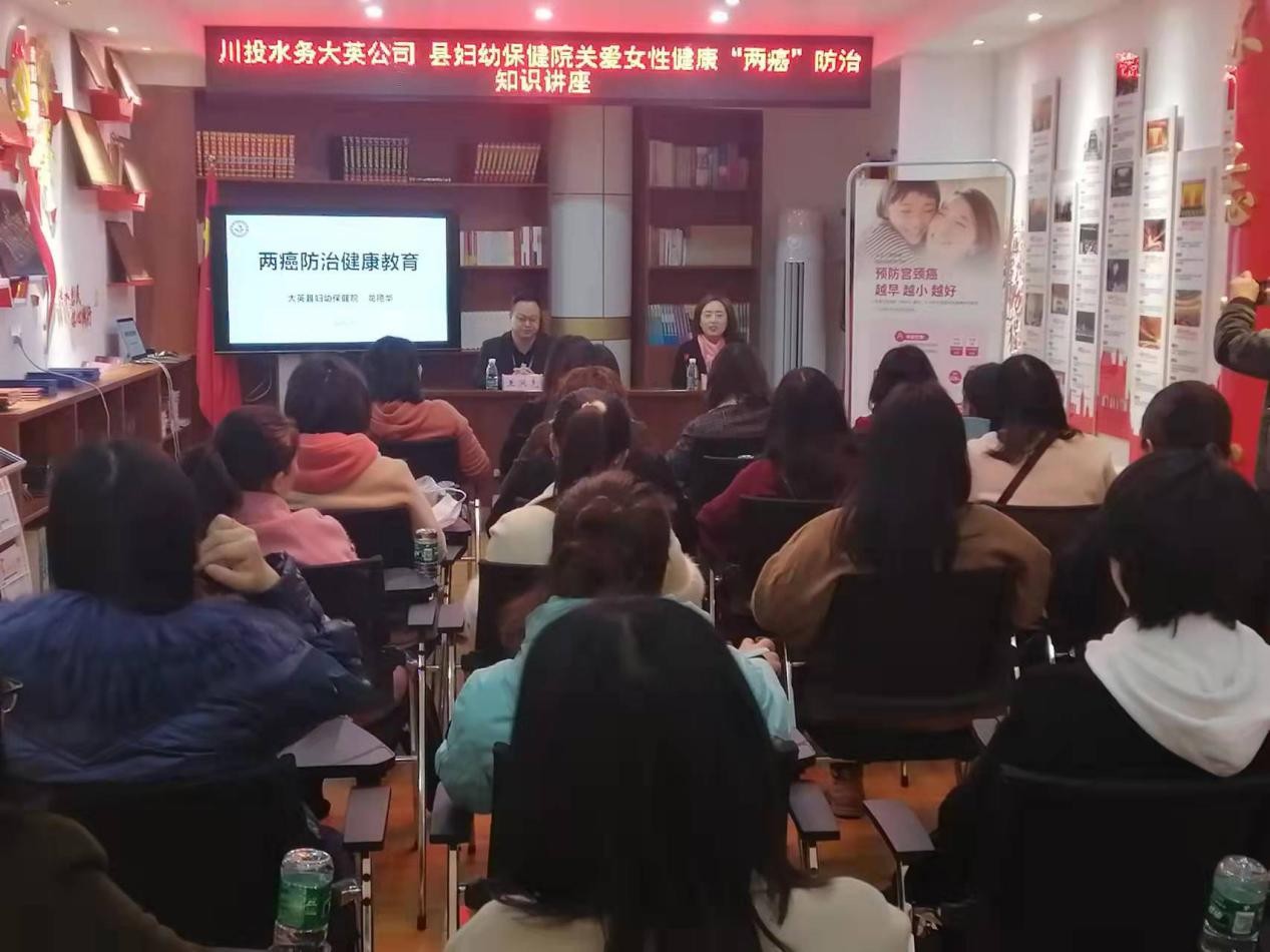 為切實(shí)維護(hù)廣大女性同胞的身心健康,提高全體女干部職工的健康保健意識(shí)。在“三八”國際勞動(dòng)?jì)D女節(jié)來臨之際,3月4日上午,川投水務(wù)大英公司黨支部、工會(huì)與大英縣婦幼保健院聯(lián)合舉辦關(guān)愛女性健康“兩癌”防治知識(shí)健康講座主題活動(dòng)。公司全體女黨員干部職工參加,大英縣婦幼保健院院長龍艷華主講,川投水務(wù)大英公司副總經(jīng)理、工會(huì)主席王洪先同志受公司黨支部書記、總經(jīng)理王文川同志委托出席并主持講座。