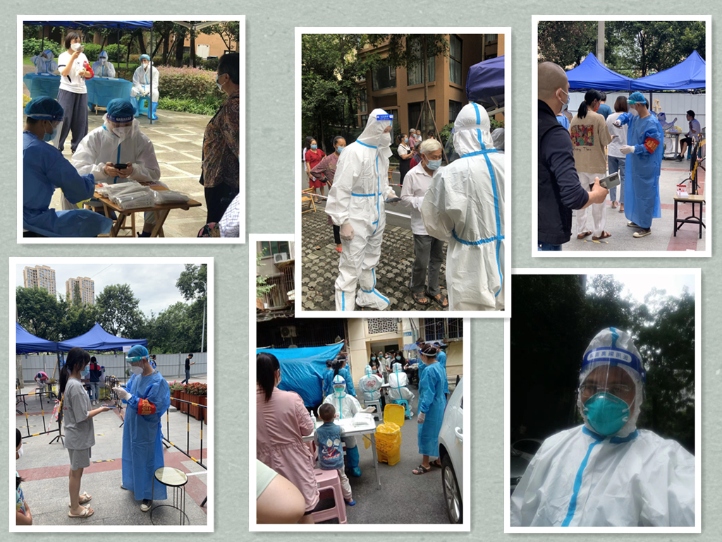 “各司其職、定格堅守”“請有序排隊、老年人請這邊先做”“大爺、大媽,我來幫您掃碼”“來小朋友,嘴巴張大,??!”“大白”“小藍”志愿者們各司其職,引導著居民們排隊掃碼核酸采樣,醫(yī)護人員們也有條不紊地為居民進行核酸采樣?!耙还芄懿蓸釉噭?、一滴滴艱辛汗水、一條條臉龐勒痕”他們沒有喊苦喊累,依然用心用情地為居民們服務。