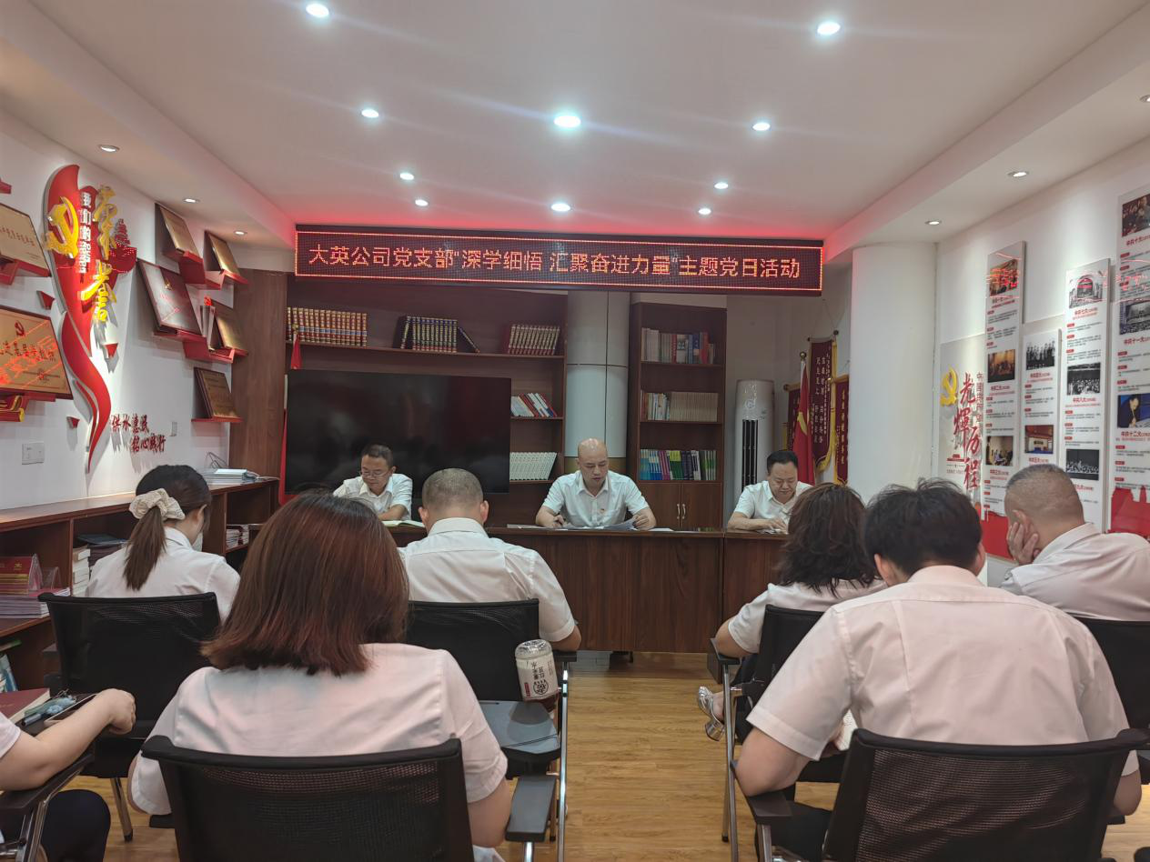 為深入貫徹習(xí)近平新時(shí)代中國特色社會主義思想和黨的二十大精神,進(jìn)一步強(qiáng)化黨員干部的理論武裝,凝聚干事創(chuàng)業(yè)的強(qiáng)大合力,大英公司黨支部于8月28日在公司5樓黨員活動室組織開展了“深學(xué)細(xì)悟 匯聚奮進(jìn)力量”主題黨日活動。全體黨員及入黨積極分子參加了此次活動,活動由黨支部書記王文川主持。