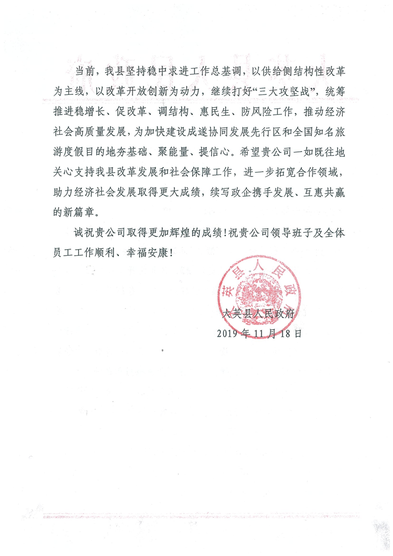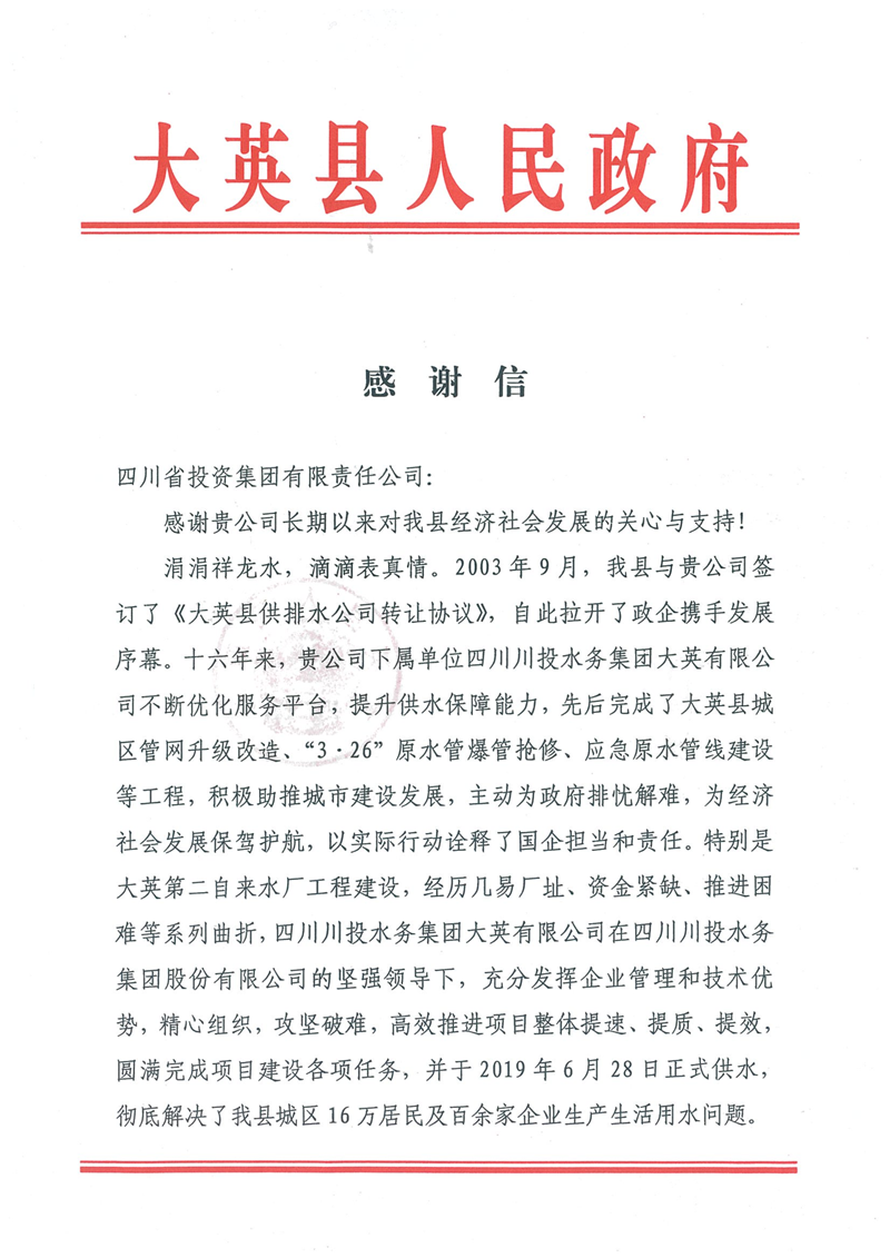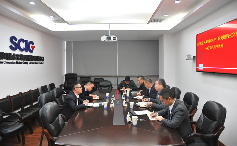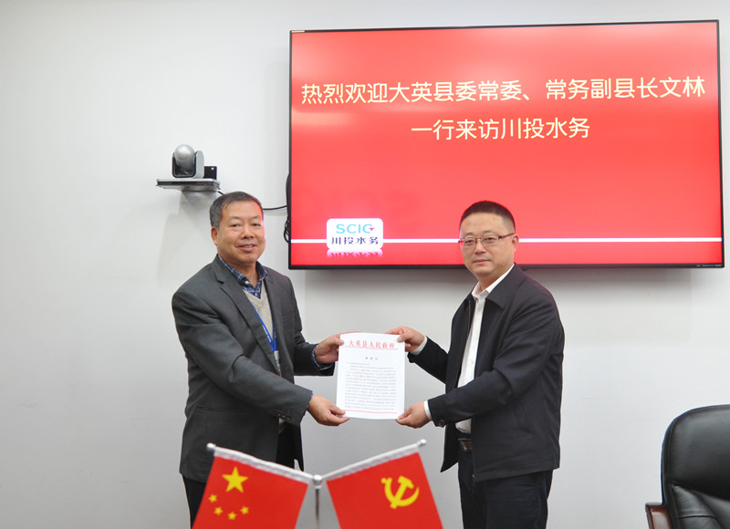 2019年11月19日,大英縣委常委、縣人民政府常務(wù)副縣長文林來訪川投水務(wù),并代表大英縣人民政府向川投集團(tuán)、川投水務(wù)送來感謝信。川投水務(wù)黨委書記、董事長梁有國,黨委副書記、總經(jīng)理鄧銳在川投大廈24樓會議室會見文副縣長一行。