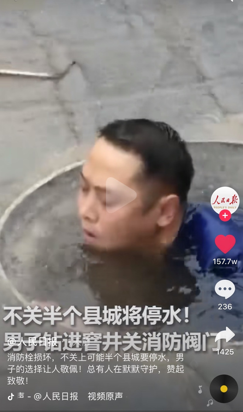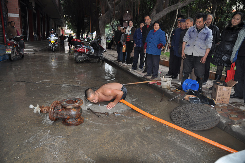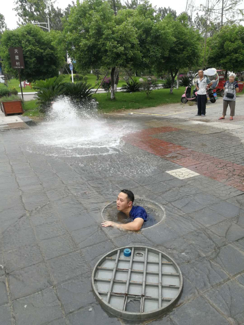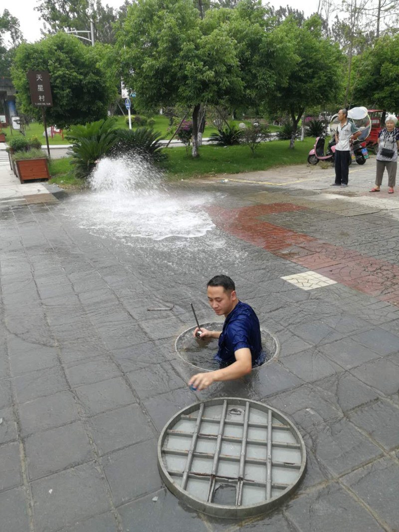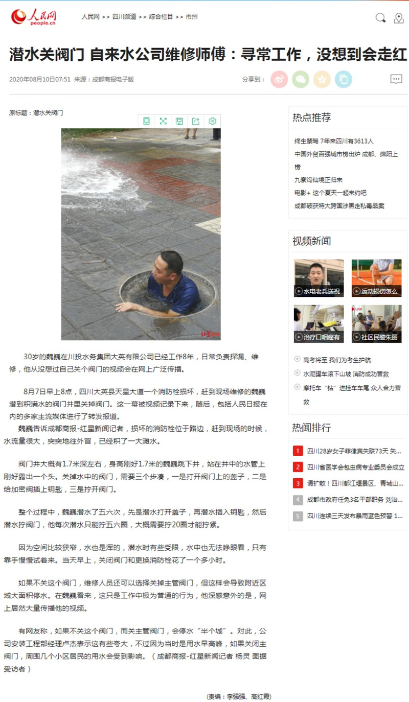 事情的經(jīng)過(guò)是這樣:2020年8月7日早上8時(shí)許,四川省大英縣天星大道一消防栓損壞,川投水務(wù)大英水司聞?dòng)嵉谝粫r(shí)間組織維修搶險(xiǎn)隊(duì)伍前往現(xiàn)場(chǎng)排險(xiǎn)處置。當(dāng)維修人員趕到現(xiàn)場(chǎng)時(shí),消防水呈水柱狀外噴,不僅路面大量積水,閥門井也早已被外噴的消防水灌滿。此時(shí)正值用水早高峰,如果選擇關(guān)掉主管閥門,將會(huì)導(dǎo)致附近區(qū)域大面積停水。為了最大限度保障城區(qū)居民用水,視頻中的主人公魏巍不假思索地撬開(kāi)閥門井蓋,在短短1分多鐘時(shí)間內(nèi)5次潛至近2米深的水下成功關(guān)閉閥門,并以最快的速度更換損壞的消防栓,恢復(fù)了該片區(qū)的正常供水,沒(méi)有引發(fā)大面積停水。