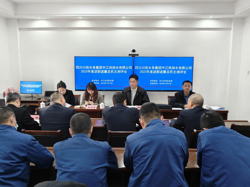 2024年1月12日,川投水務(wù)集團(tuán)副總經(jīng)理譚衛(wèi)鵬率黨群工作部部長(zhǎng)李至彬一行赴中江公司開展2023年度黨群、紀(jì)檢、人力資源、合規(guī)化管理綜合考評(píng),并召開述職述廉及民主測(cè)評(píng)會(huì)。中江公司領(lǐng)導(dǎo)班子、中層管理人員及職工代表共計(jì)32人參加考評(píng)會(huì)議。